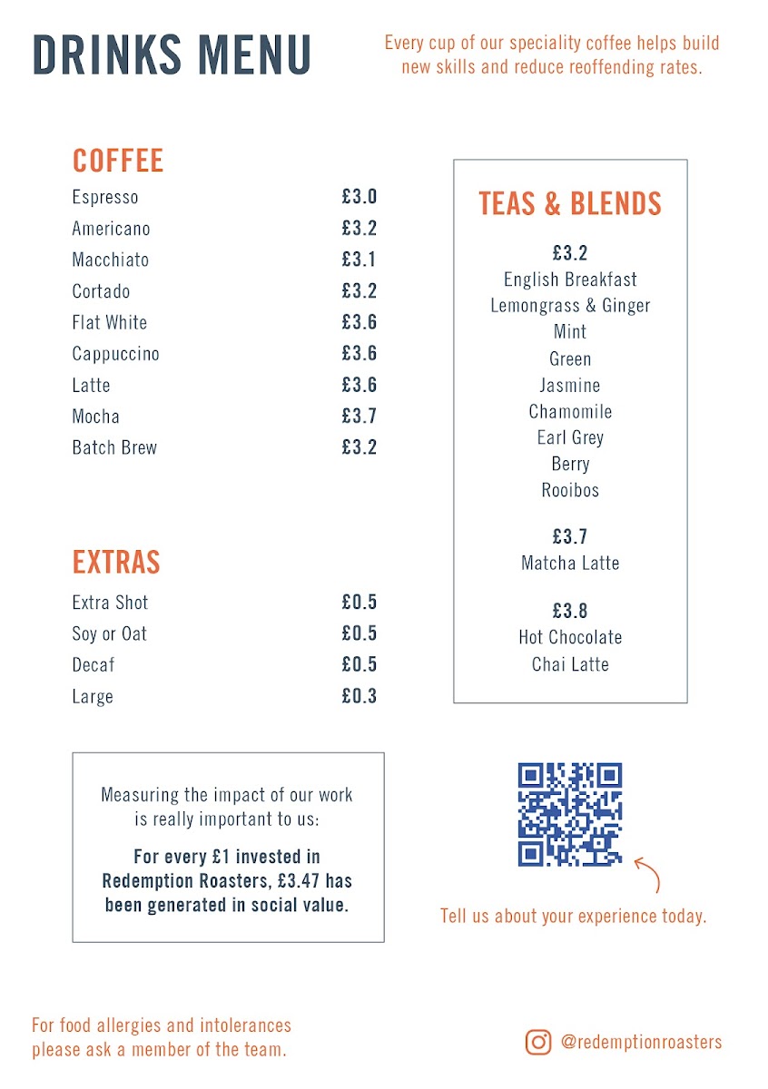 Redemption Roasters, located at Unit 109 Stable St, London N1C 4DR, offers a unique and refreshing experience for coffee lovers. Their menu, centered around high-quality coffee and skillfully crafted beverages, caters to those who appreciate both flavor and sustainability. As a roastery with a social mission, Redemption Roasters provides training and job opportunities to ex-offenders, making every cup you enjoy not only a treat for your taste buds but also a contribution to a positive change.